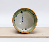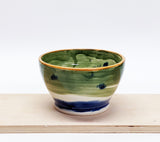 Bol en porcelaine à motifs verts, bleus et orange recouvert d'une glaçure transparente de qualité alimentaire.